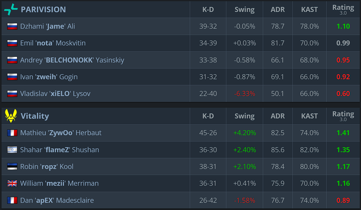 Vitality delivered a mature and controlled series, not allowing PARIVISION to execute their game plan on either Mirage or the more competitive Inferno. The key difference was a more stable structure, higher quality execution in critical moments, and a strong performance from ZywOo. PARIVISION remained competitive, especially on the second map, but it was not enough to push the series to Dust2. As a result, Vitality advance directly to the semi-finals, while PARIVISION drop to the quarter-finals.