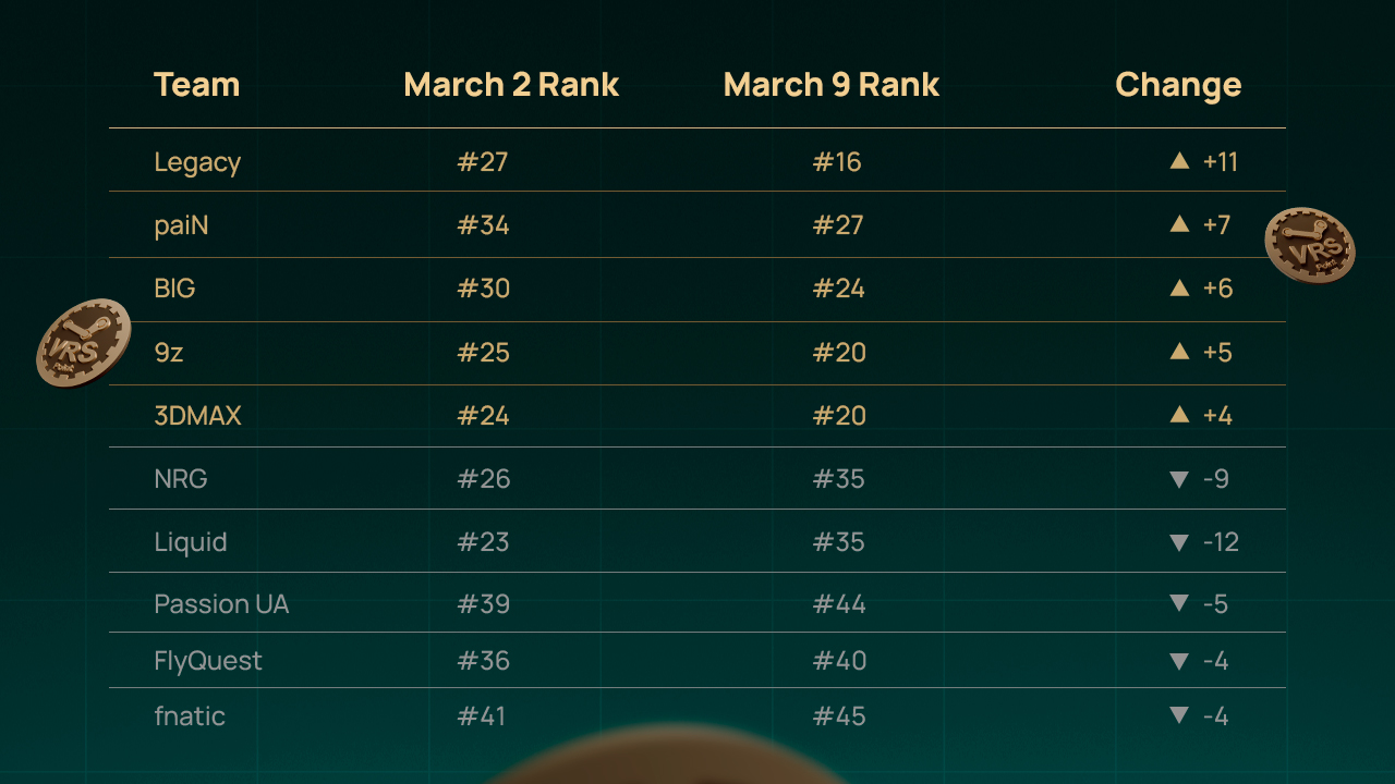 Legacy produced the biggest jump of the week. During ESL Pro League Season 23, the team secured several important wins against higher-ranked opponents, including a victory over NAVI. That single win alone generated around +30 VRS points, illustrating how valuable victories against stronger teams can be in the system. These results allowed Legacy to climb dramatically in the ranking and re-enter the competitive mid-table battle.
