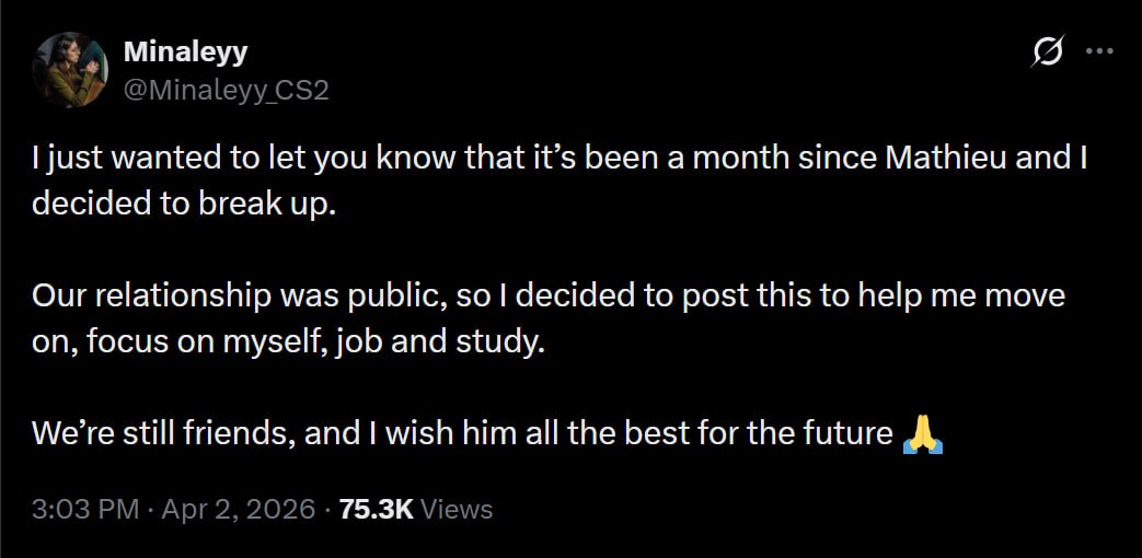 As of now, the main point of the story is quite straightforward: ZywOo and his girlfriend broke up a month ago, and only now chose to make it public. According to MinaIeyy, they remain friends, and she wants to move forward and focus on herself.