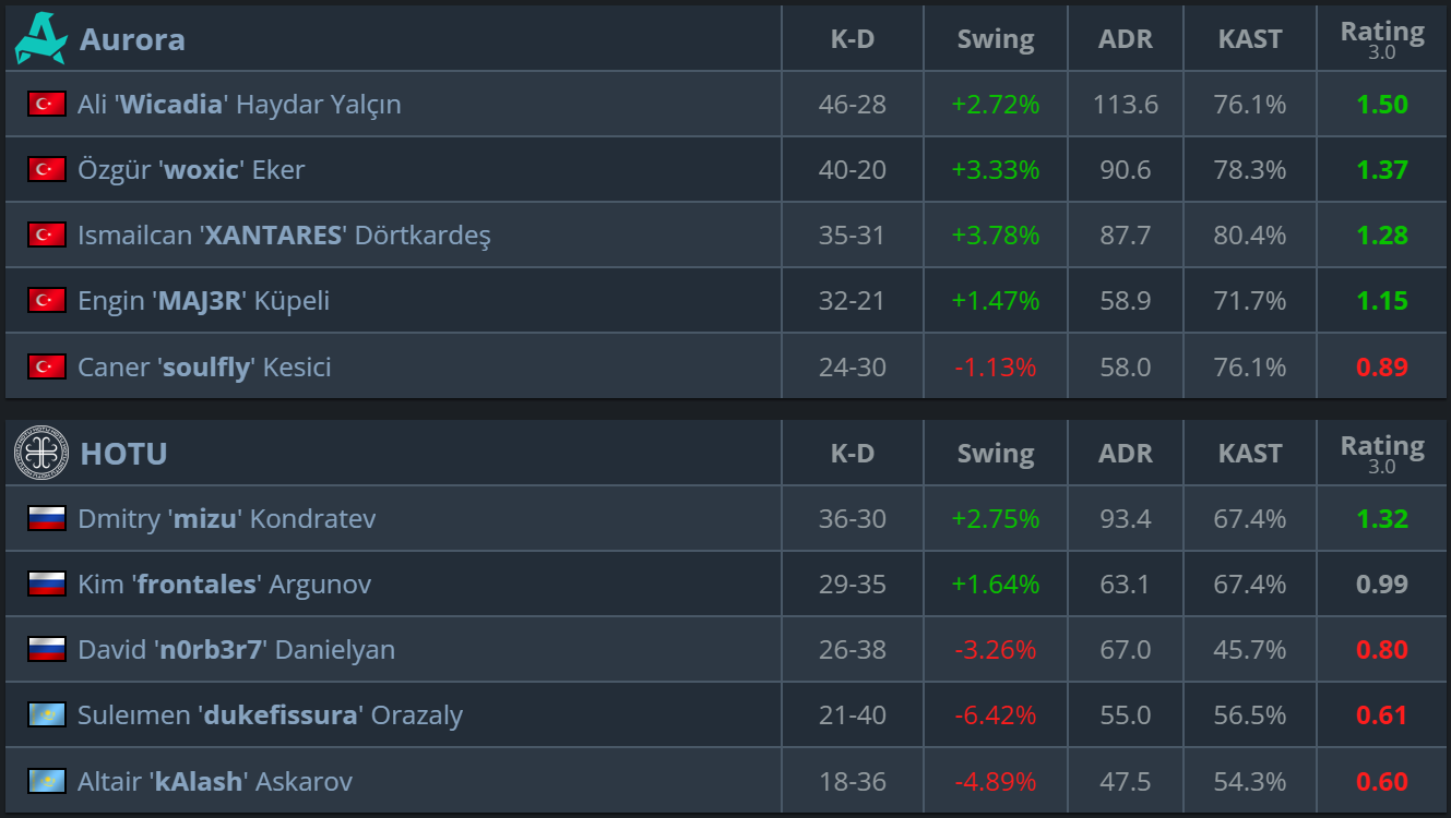 Aurora jugó la serie en dos modos diferentes, pero en ambos casos siguió siendo el bando fuerte. En Mirage, el equipo superaba completamente a HOTU y casi no daba oportunidad a su oponente de contraatacar. En Dust2, el partido fue mucho más igualado, pero incluso ahí Aurora no perdió el control en los momentos decisivos y cerró el mapa en la prórroga. Como resultado, Aurora comienza el Grupo B con confianza y avanza a las semifinales superiores, mientras que HOTU se ve obligado a continuar el torneo hasta la primera ronda inferior.