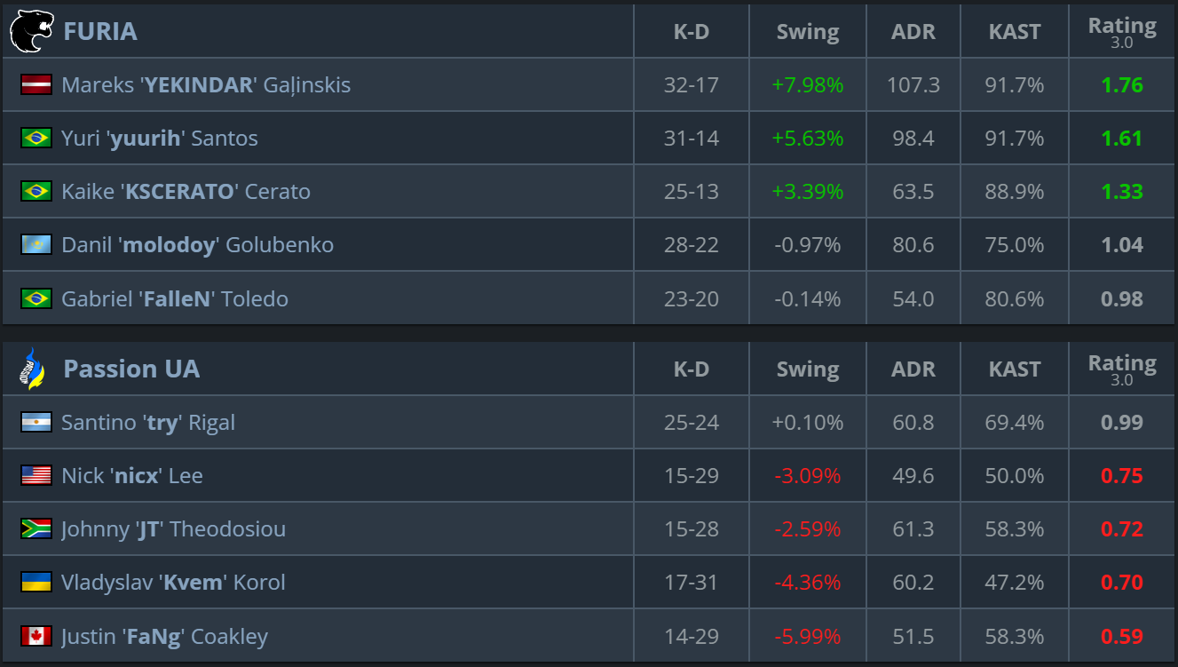FURIA ofreció una serie muy limpia y controlada, sin permitir que Passion UA imponiera realmente una pelea. El momento clave fue el colapso del equipo ucraniano tras su propia elección del Inferno, tras lo cual el partido pasó inmediatamente al guion de la plantilla brasileña.