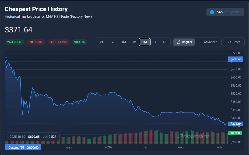 Según datos del mercado (ver captura de pantalla 6), el precio de la skin ha caído a unos 371,64 dólares, a pesar de estar valorado en aproximadamente 690–750 dólares en otoño de 2025.