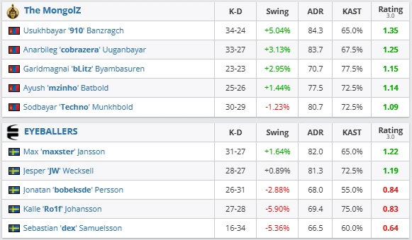 Le camp mongol prit immédiatement le contrôle. Ils remportaient les duels d’ouverture, géraient efficacement la carte et forçaient constamment les EYEBALLERS à se placer en défense. Le côté suédois peinait à trouver des solutions cohérentes et perdait souvent des positions sans résistance.