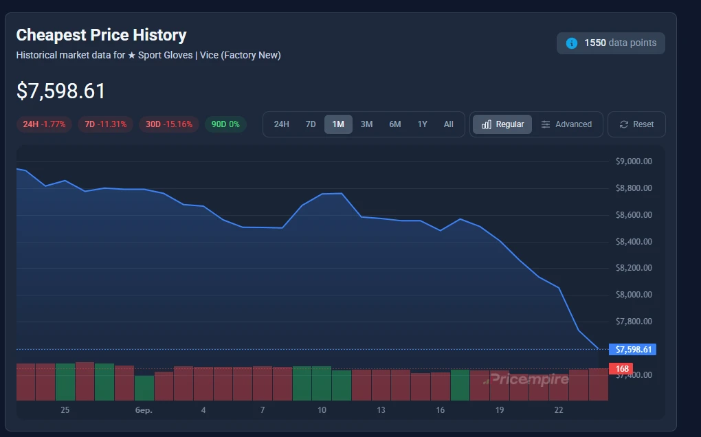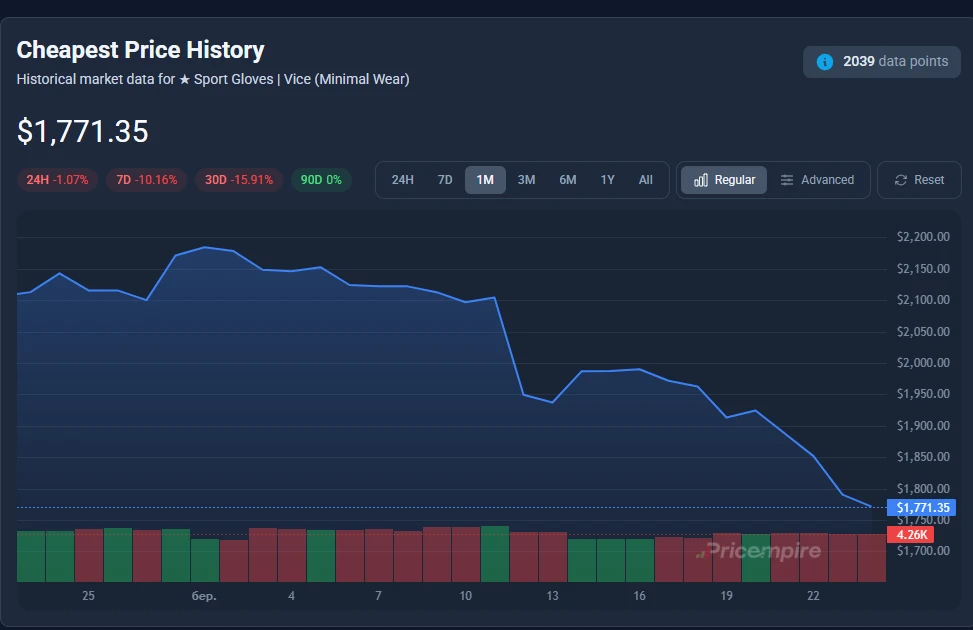 La version Minimal Wear affiche un падіння encore plus net. Les prix sont tombés à environ 1 771 $. Cela équivaut à une baisse hebdomadaire de plus de 10 % et près de 16 % au cours du mois dernier. Ces chiffres correspondent étroitement au tweet viral. Il y a quelques jours à peine, les gants étaient annoncés à environ 1 949 $. Depuis, le déclin s’est poursuivi.
