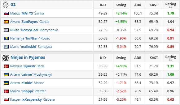 G2는 ESL 프로 리그 시즌 23 1단계 스위스 결승전에서 닌자스 인 파자마스를 2-0으로 꺾으며 스웨덴 조직을 탈락시키고 대회 2단계에 진출했습니다. 이 시리즈는 마투시 “MATYS” 시므코의 뛰어난 활약으로 정의되었으며, 그는 두 맵 모두에서 압도적인 활약을 펼치며 1.79의 평점으로 경기를 마치고 경기 최우수 선수상을 수상했습니다. NiP에게는 이 패배로 혼란스러운 스위스 캠페인 끝에 1단계 진출이 끝났고, G2는 탈락전을 통과해 대회를 계속 이어갔다.