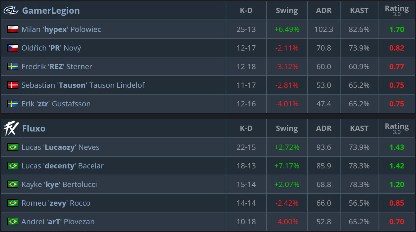 Fluxo는 이번 라운드 최대의 이변 중 하나를 연출하며, 랭킹 상위 팀인 GamerLegion을 Nuke에서 13:10으로 꺾었다. 브라질 팀은 여러 차례 중요한 클러치 라운드를 따냈고, Lucaozy의 인상적인 폼이 전반 7:5를 마친 뒤 후반 승리를 확정지었다.