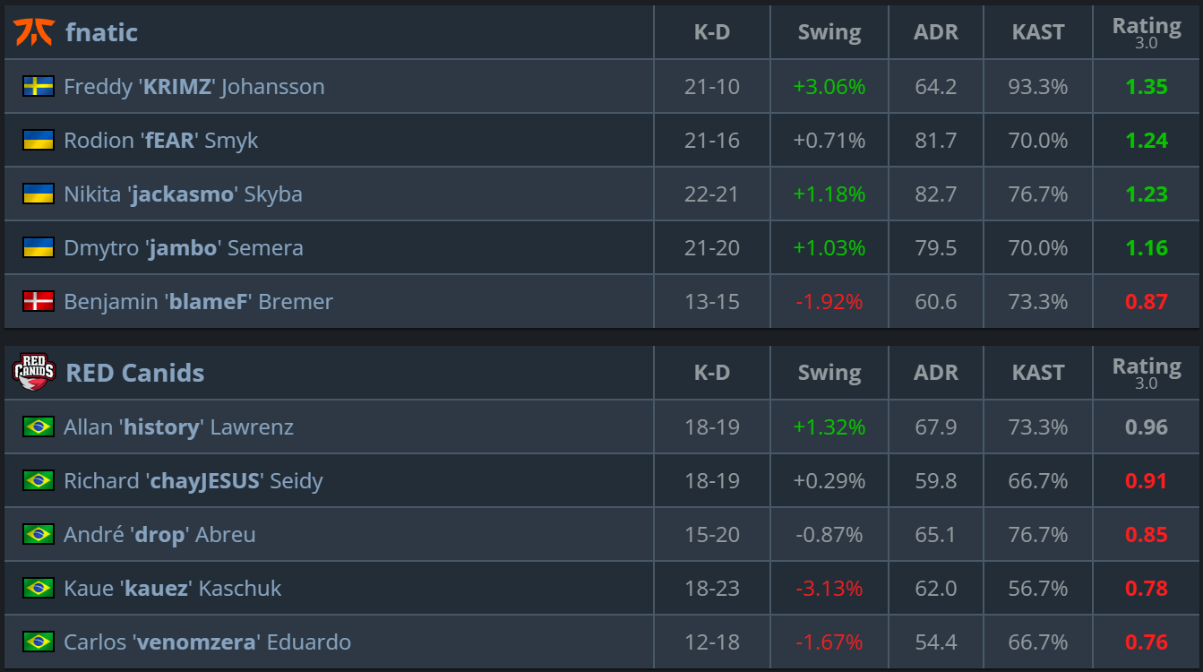 fnatic은 Ancient에서 RED Canids를 상대로 16:14의 값진 승리를 거두었다. 경기는 KRIMZ의 믿기 어려운 ACE 덕분에 연장전에 돌입했으며, 그는 연장 라운드에서도 계속해서 압도적인 활약을 펼쳤다.