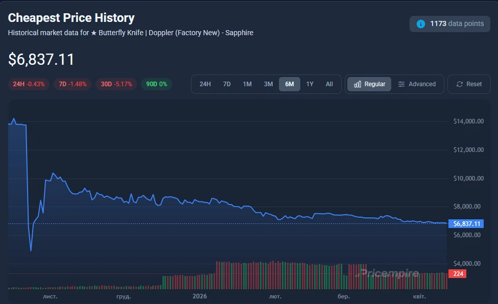 O mercado de skins do CS2 está a passar por mais uma grande queda — desta vez com uma das facas mais prestigiadas do jogo, a Butterfly Knife | Doppler (Fábrica Nova) Safira. Nos últimos meses, o seu preço caiu mais de 50%, desencadeando uma intensa discussão em toda a comunidade. Em outubro de 2025, a faca estava avaliada em mais de $14.400, mas em abril de 2026 desceu para cerca de $6.800–6.900, representando uma queda de -$7.500 (-52%) num período relativamente curto.