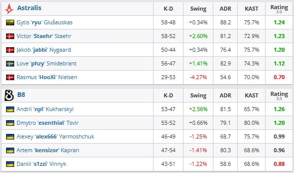 Orta raunddaki etkisi ve kilit durumlarda gösterdiği soğukkanlılık çok önemli rol oynadı. jabbi (1.20) da önemli katkı sağladı, çünkü Astralis dengeli bir birim olarak işlev gördü. B8 için NPL (1.26) ve esenthial (1.20) öne çıktı, ancak takım genel olarak tutarlılıktan yoksundu.