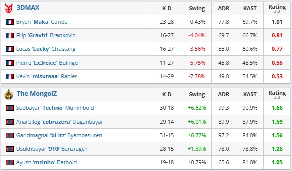 Techno, olağanüstü bir performans sergileyerek seriyi 1.66 reyting ve 99.3 ADR ile tamamladı. Onun etkisi oyunun her aşamasında hissedildi — bomba noktalarını demirlemekten kilit düelloları kazanmaya kadar. The MongolZ’un hakimiyetinin itici gücü ve serinin rekabetçi hale gelmemesinin önemli nedenlerinden biriydi.