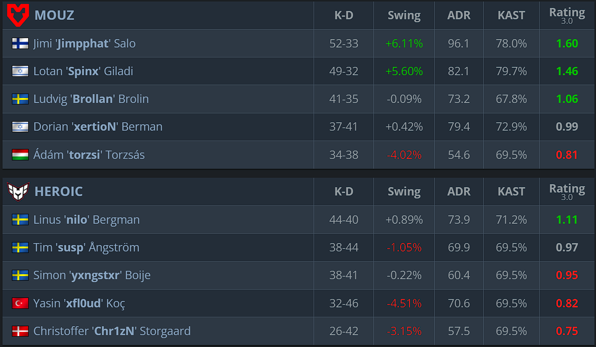 MOUZ 在輸掉第一張地圖後展現了穩定性和強大的適應能力。隊伍成功在幻影上完全掌控主導權,並在地獄城中大放異彩。HEROIC 開局不錯,但下半場未能維持節奏,最終決定了最終結果。